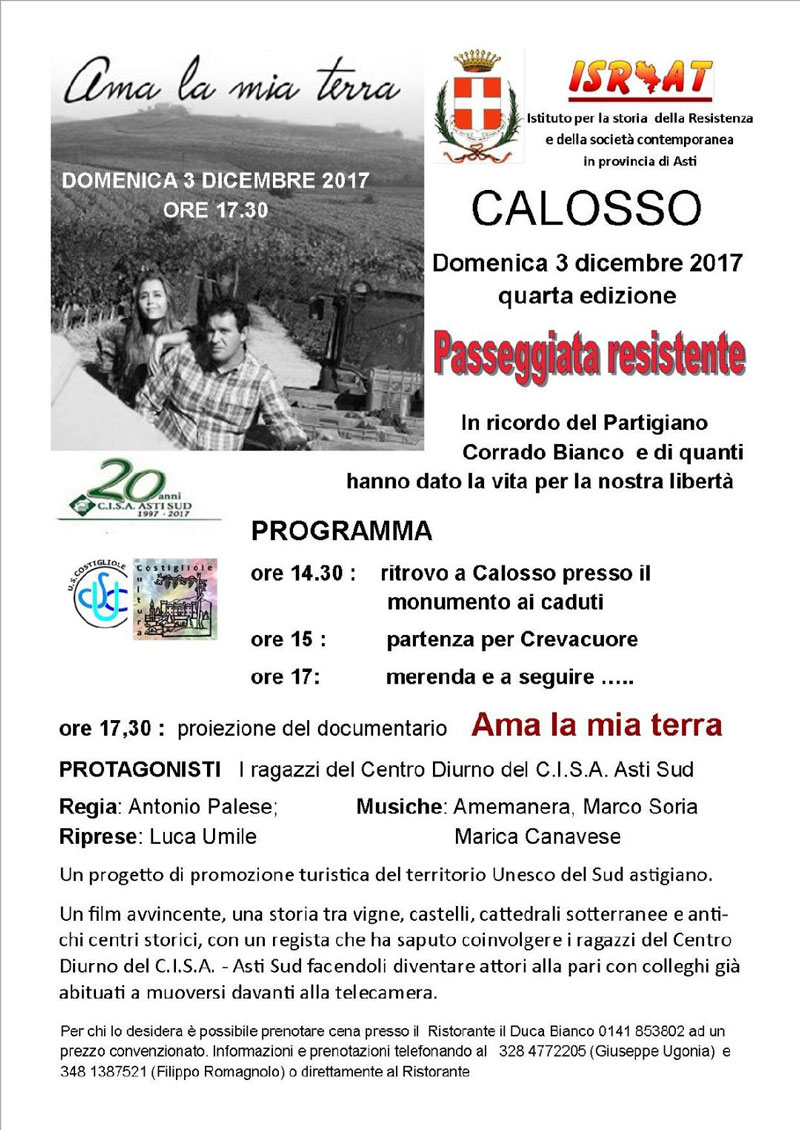 Calosso. In ricordo del Partigiano Corrado Bianco Barbarossa. La passeggiata si svolge a cadenza annuale. Approfondimenti Locandina edizione 2016 Locandina edizione 2017 Locandina edizione 2022 Presentazione del libro "Racconto di Gino e Luisin. Viale Corrado Bianco" ozio_gallery_nano